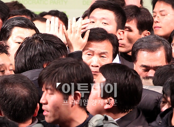민주당 야권통합안이 11일 오후 송파구 잠실실내체육관에서 진행된 임시전국대의원대회를 거쳐 가결됐다. 민주당 손학규 대표가 통합안에 반대하는 당원들의 몸싸움에 관계자들의 보호를 받고 있다.