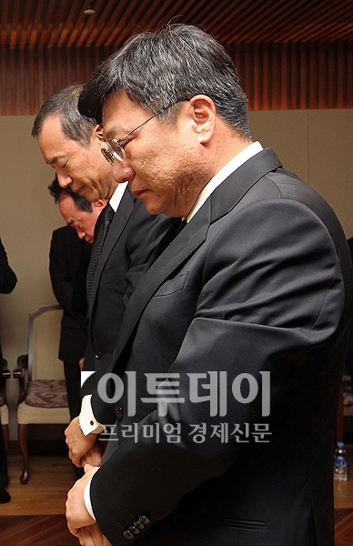 박정희 대통령의 아들 박지만씨와 최치훈 삼성카드 사장이 14일 오전 故 박태준 포스코 명예회장의 빈소가 차려진 서울 신촌 세브란스 장례식장을 찾아 조문을 하고 있다. 임영무 기자 darkroom519@