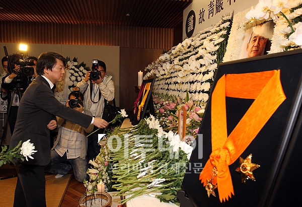 안철수 서울대학교 융합과학기술원장이 14일 저녁 서울 신촌 세브란스병원에 마련된 고 박태준 포스코 명예회장 빈소에 헌화하고 있다.