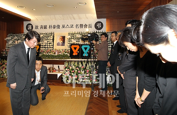 안철수 서울대학교 융합과학기술원장이 14일 저녁 서울 신촌 세브란스병원에 마련된 고 박태준 포스코 명예회장 빈소에 조문후 유가족들과 인사를 나누고 있다.