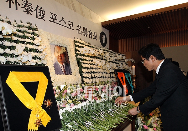 김문수 경기도지사가 14일 저녁 서울 신촌 세브란스병원에 마련된 故 박태준 포스코 명예회장 빈소 를 찾아 헌화하고 있다.