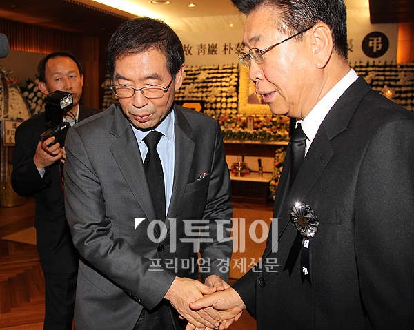 박원순 서울시장이 14일 저녁 서울 신촌 세브란스병원에 마련된 故 박태준 포스코 명예회장 조문을 마치고 정준양 회장과 악수를 나누고 있다.