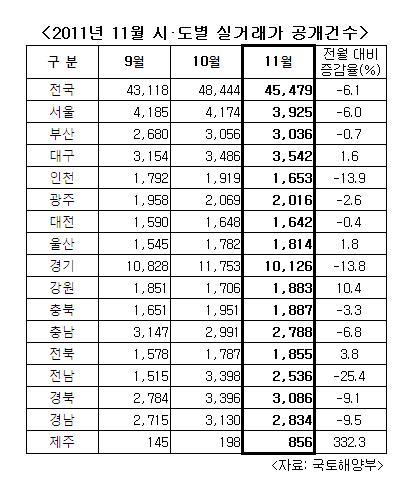 국토해양부는 지난달 신고된 아파트 실거래건수가 4만5479건으로 지난달(4만8444건)에 비해 6.1%, 지난해 같은 기간(5만3558건) 보다 15.1%씩 하락했다고 15일 밝혔다.