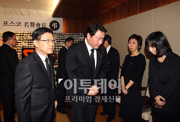 최태원 SK회장이 15일 오전 故 박태준 포스코 명예회장의 빈소가 마련된 서울 신촌 연대 세브란스 장례식장에서 조문을 마치고 유가족과 인사를 나누고 있다.