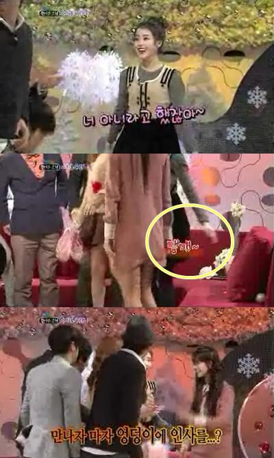 지난 13일 방송된 KBS2 '김승우의 승승장구'에 출연한 아이유는 이날 '몰래온 손님'에 절친한 걸그룹 미스에이의 수지가 등장하자 수지의 엉덩이를 때리는 듯한 동작을 취했다.