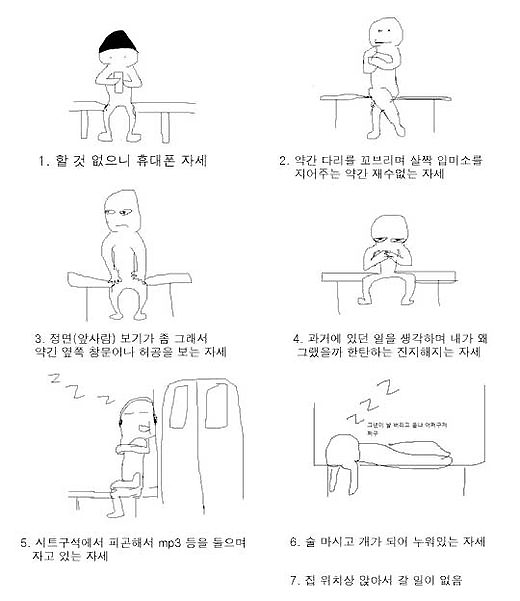 이 그림은 지하철 좌석에 혼자 앉아서 가는 승객들의 자세를 '할 것 없으니 휴대폰 자세', '약간 다리를 꼬브리며 살짝 입미소를 지어주는 자세' 등 7가지 유형으로 나눠 자세히 설명하고 있다.