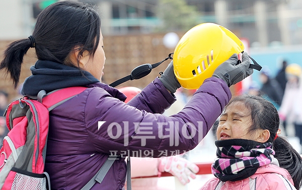 사흘동안 이어졌던 강추위가 풀려 한낮 기온이 영상으로 회복된 18일 오후 주말을 맞아 가족과 함께 서울광장 스케이트장을 찾은 어린아이가 헬멧을 쓰고있다.