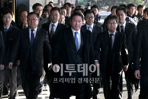 거액의 회삿돈을 횡령한 혐의를 받고 있는 최태원 SK그룹 회장이 19일 오전 서초동 서울중앙지검에 출석하고 있다.