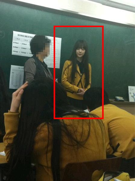 사진 속 설리는 교실 앞쪽에서 선생님 옆에 다소곳한 모습으로 서 있다. 겨자색 교복을 입은 설리는 인형같은 비율을 자랑하고 있다. 특히 긴 생머리와 하얀 피부, 조막만한 얼굴이 눈에 띈다.