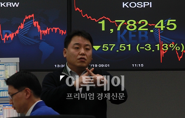 김정일 북한 국방위원장 사망에 코스피 지수가 폭락하고 금융지상이 패닉에 빠졌다. 19일 오후 소공동 외환은행 딜링룸에서 코스피 지수가 하락폭을 줄이며 1782.45를 나타내고 있다.