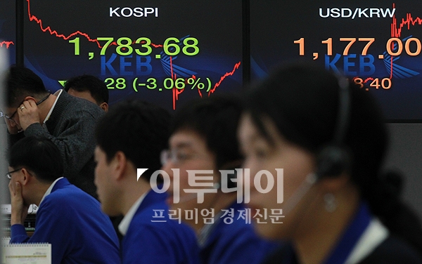 김정일 북한 국방위원장 사망에 코스피 지수가 폭락하고 금융지상이 패닉에 빠졌다. 19일 오후 소공동 외환은행 딜링룸에서 코스피 지수가 하락폭을 줄이며 1783.68을 나타내고 있다.