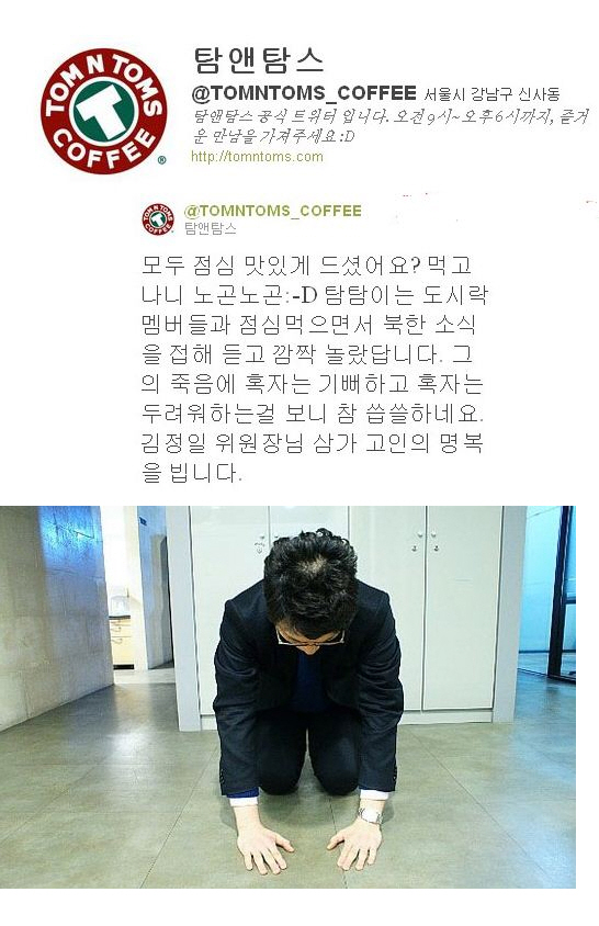 김 위원장의 사망 소식이 발표된 지난 19일 탐앤탐스의 트위터에는 “점심 먹으면서 북한 소식을 접해 듣고 깜짝 놀랐다. 그의 죽음에 혹자는 기뻐하고 혹자는 두려워하는 걸 보니 참 씁쓸하다. 김정일 위원장님 삼가 고인의 명복을 빕니다”고 글이 올라왔다.