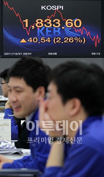 유럽의 재정위기의 안정소식과 미국의 신규 주택착공건수의 증가등의 소식으로 국내주가가 급등하고 있다. 21일 오전 코스피 지수가 전날보다 40.54 포인트 오른 1833.60 으로 김정일 사망이후 무너진 1800선을 단번에 회복하고 있다.