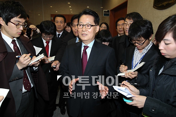 민주통합당 박지원 전 원내대표가 22일 오전 국회 정론관에서 당대표 경선 출마 선언을 한 후 취재진의 질문에 답하고 있다.