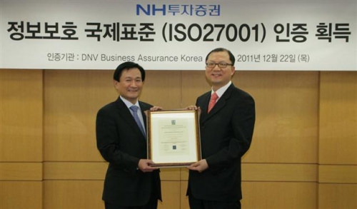 NH투자증권은 22일 서울 영등포구 여의도동 본사 대회의실에서 ‘정보보호 국제표준 ISO27001 인증 수여식’을 갖고 ISO 인증서를 받았다고 밝혔다.