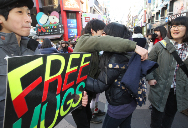 성탄절인 25일 오후 명동 거리에서 학생들이 무리 지어 행인들에게 '프리 허그'를 선사하고 있다.