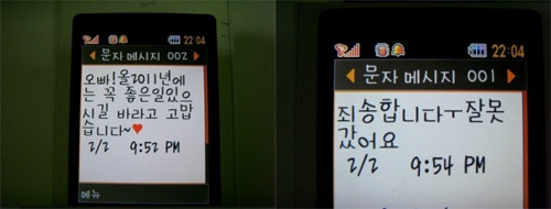 첫번째 사진 속에는 여후배에게서 온 첫번째 문자가 담겨 있다. 문자에는 "오빠! 올 2011년에는 꼭 좋은 일 있으니실 바라고 고맙습니다~♥"라며 다정한 문구화 하트가 붙어있다.