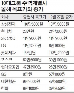 삼성전자와 대한항공도 증권사의 기대를 저버리지 않았다. 지난해 79만9000원으로 시작한 삼성전자의 주가는 연말 94만5000원을 기록하면서 증권사의 목표주가 95만원을 달성했다. 대한항공은 6만9600원을 기록해 증시 전문가들의 예상 목표주가 7만4000원에 근접하는 모습을 보였다. LG도 8만7300원을 찍으면서 증권사 목표주가 9만1000원의 96% 수준을 보였다.