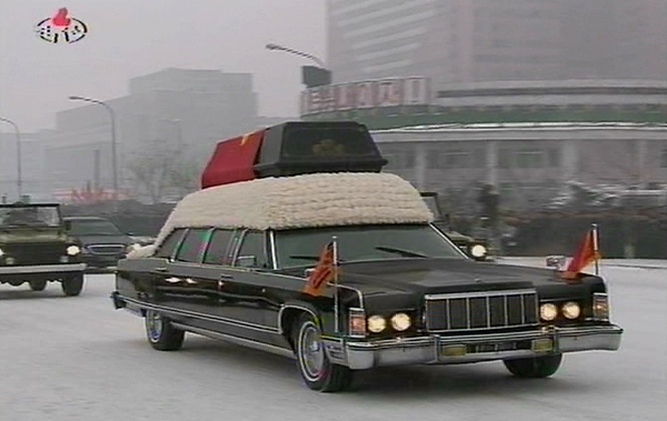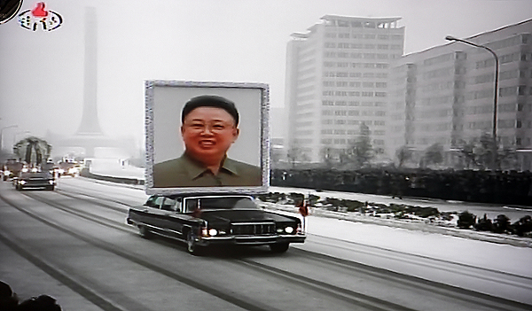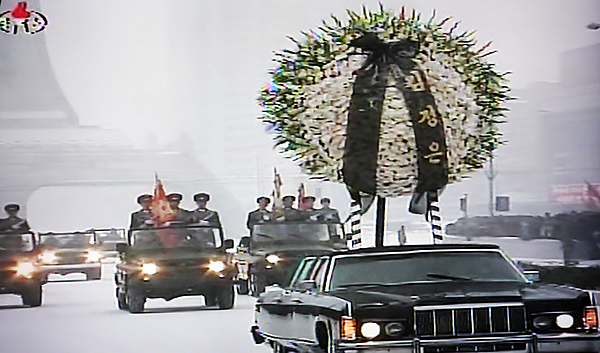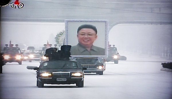 김정일 국방위원장의 대형 영정을 선두로 한 운구행렬이 28일 평양 금수산 기념궁전 앞 광장을 떠나 금성거리, 비파거리 등 평양시내를 지나고 있다