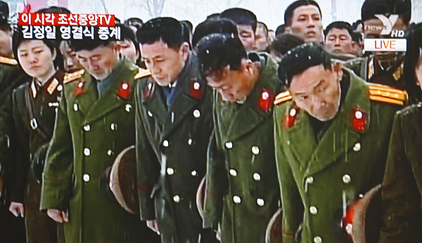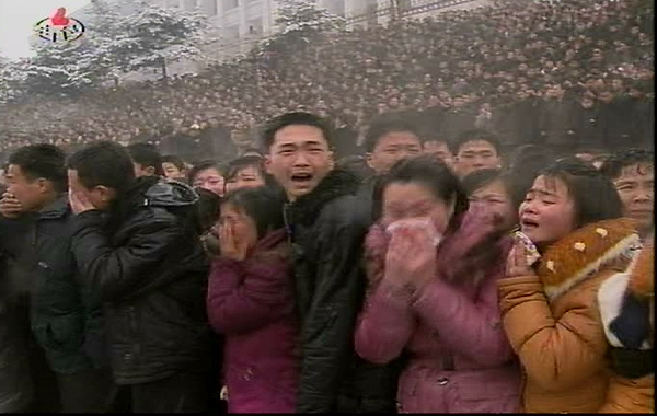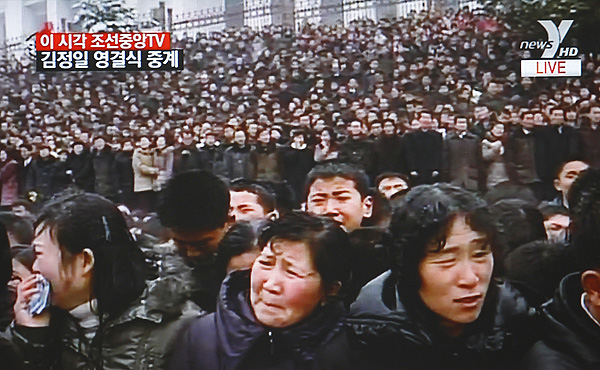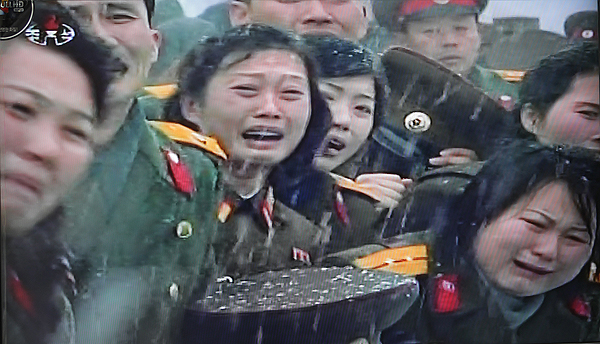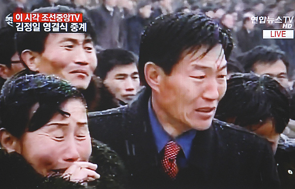 김정일 국방위원장의 대형 영정을 선두로 한 운구행렬이 28일 평양 전쟁승리기념관을 지나자 군중들이 오열하고 있다