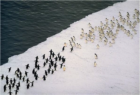 사진속에는 수십마리의 펭귄들이 양편으로 나뉘어 대치되고 있는 상황이다. 마치 펭귄들이 패싸움을 하려고 서로 다가가는 것 같아 눈길을 끌고 있다.