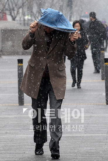 영하에 날씨에 눈까지 내리는 3일 오후 서울 여의도에서 한 시민이 손수건으로 눈을 막으며 걸어가고 있다.