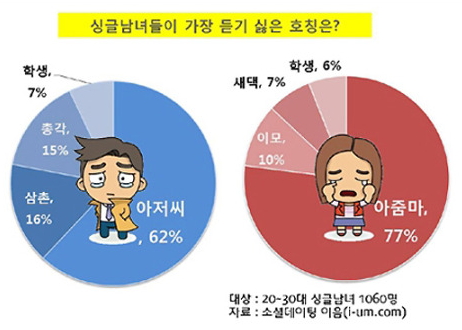 남성은 최악의 호칭으로 '아저씨'(66%)를 여성은 '아줌마'(77%)를 꼽아 눈길을 끌었다.