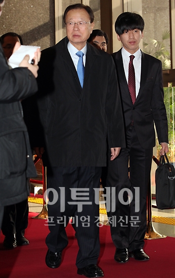 한나라당 전당대회 당시 돈봉투 사건과 관련됐다는 의혹을 받고 있는 박희태 국회의장이 6일 오전 국회로 들어서고 있다.