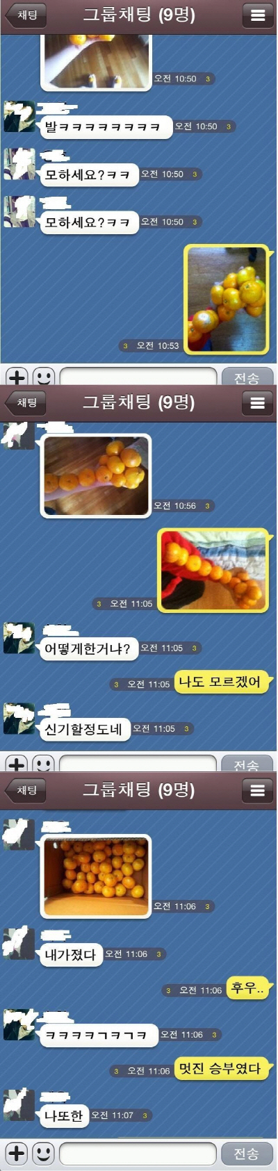 6일 각종 온라인 커뮤니티 게시판에는 '귤 배틀'이라는 제목으로 한 친구들이 카카오톡을 통해 주고받은 대화가 공개됐다.