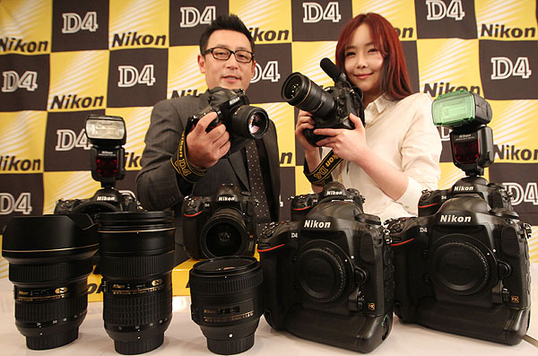 니콘이미징코리아는 프로사진가를 위한 DSLR 카메라 D4와 AF-S NIKKOR 85mm f/1.8G 렌즈를 6일 전세계 동시 발표했다. D4는 대형 이미지 센서인 니콘 FX 포맷 CMOS 센서를 채택하고 있으며 유효 화소수 16.2메가 픽셀, 감도는 ISO 100부터 12,800까지 지원한다(확장시에는 ISO 50-204,800 가능). 초당 30프레임, 1920x1080 사이즈로 풀HD 동영상을 최대 29분59초 연속 촬영할 수 있는 `디무비(D-Movie)'도 탑재했다. 이날 서울 중구 태평로 프레스센터에서 개그맨 이병진 씨와 모델이 제품을 선보이고 있다.