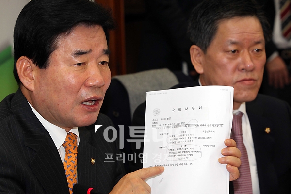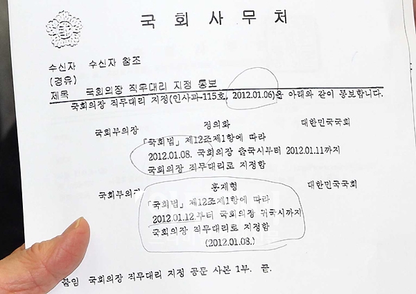 김진표 민주통합당 원내대표가 12일 오전 국회에서 열린 원내대책회의에 참석해 국회 사무처가 발송한 ‘국회의장 직무대리 지정 통보’라는 서류를 보이고 있다. 김 원내대표는 이 서류가 박희태 국회의장이 출국 전 국회부의장에게 출국 기간동안 직무를 이임한 문서라고 밝혔다.