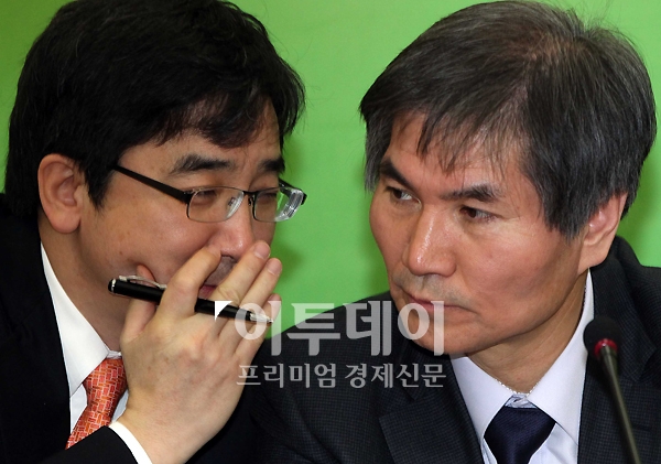 이용선 민주통합당 공동대표가 12일 오전 국회 당대표실에서 열린 민주통합당 헌법 제119조 경제민주화특별위원회 기자간담회에 참석해 유종일 위원장과 귀엣말을 나누고 있다.