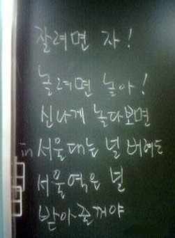 최근 온라인 커뮤니티 게시판에 선생님이 칠판에 학생들에게 충고 3가지를 적은 사진이 올라왔다. 이 사진에서 선생님은 학생들에게 “잘려면 자! 놀려면 놀아! 신나게 놀다 보면 서울대는 널 버려도 서울역은 널 받아줄꺼야”라는 재치 있는 충고를 했다.