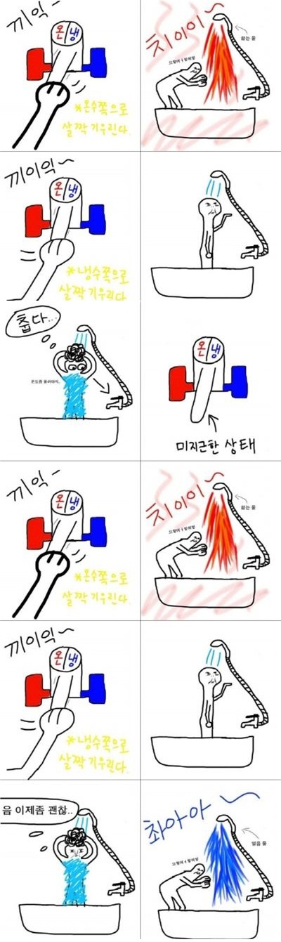 최근 온라인 커뮤니티 게시판에 겨울철 많은 사람들이 샤워 할 때 겪는 일을 '겨울 사워 공감' 이라는 그림으로 적절히 표현해 네티즌들에게 공감을 얻고 있다.