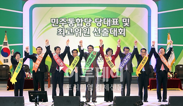 민주통합당 당대표 및 최고위원 후보자들이 15일 오후 경기도 고양시 일산 킨텍스에서 열린 ‘민주통합당 당대표 및 최고위원 선출대회’에 참석해 손을 맞잡고 대의원들에게 인사를 하고 있다.