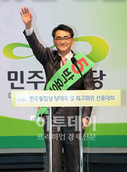 민주통합당 박용진 당대표 및 최고위원 후보가 15일 오후 경기도 고양시 일산 킨텍스에서 열린 ‘민주통합당 당대표 및 최고위원 선출대회’에서 정견발표를 하며 대의원들에게 인사하고 있다.