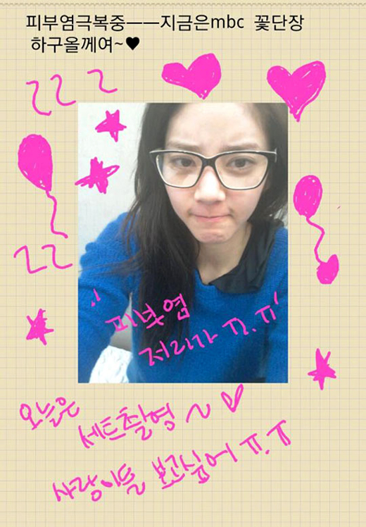 가수 손담비는 15일 자신의 트위터를 통해 “피부염 극복 중. 지금은 MBC 꽃단장 하고 올께요”라는 글과 함께 사진 한 장을 게재했다.