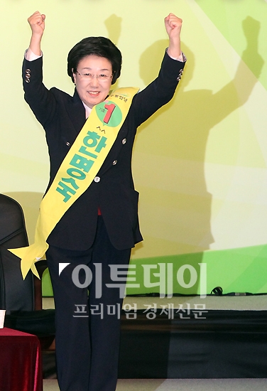 한명숙 민주통합당 초대 당대표가 15일 오후 고양시 일산 킨텍스에서 열린 ‘민주통합당 당대표 및 최고위원 선출대회’에서 당대표 선출 발표 후 환호하고 있다.