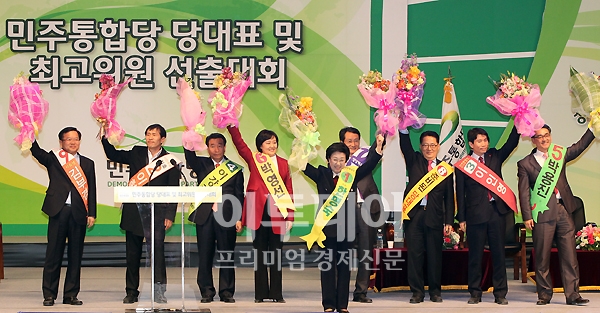 한명숙 민주통합당 초대 당대표(왼쪽 다섯번째)와 당 지도부들이 15일 오후 고양시 일산 킨텍스에서 열린 ‘민주통합당 당대표 및 최고위원 선출대회’에서 대의원들에게 인사를 하고 있다.