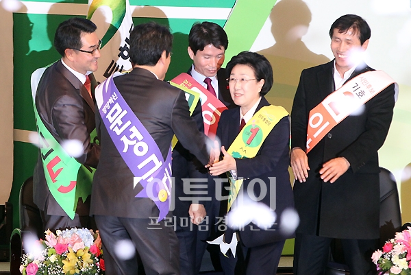 한명숙 민주통합당 초대 당대표가 15일 오후 고양시 일산 킨텍스에서 열린 ‘민주통합당 당대표 및 최고위원 선출대회’에서 최고위원들에게 축하를 받고 있다.
