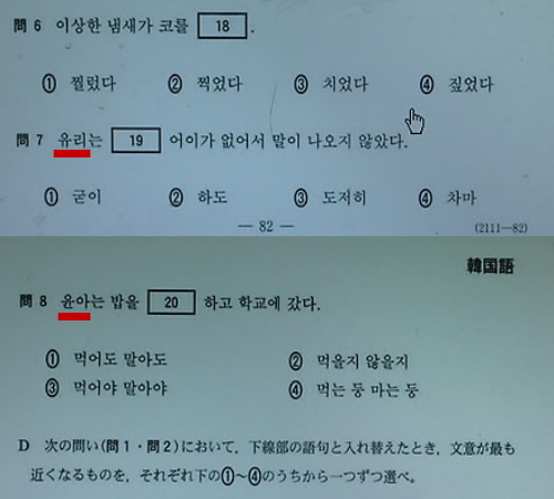 대학수학능력시험과 비슷한 일본의 대입센터시험 한국어 과목 시험 문제에 유리와 윤아란 이름이 등장한 것.