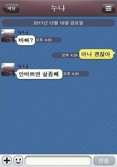 사진속 누나는 동생에게 "바빠?"라고 묻자 동생은 "아니 괜찮아"라고 답한다. 이에 누나는 "안바쁘면 살좀 빼"라고 말해 웃음을 자아낸다.