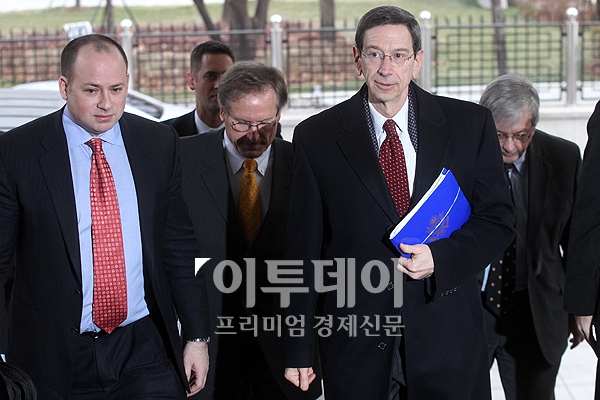 로버트 아인혼 미국 국무부 대북ㆍ대이란 제재 조정관이 17일 오전 이란산 원유 수입 제한 문제 등을 논의하기 위해 외교통상부 청사로 들어서고 있다.