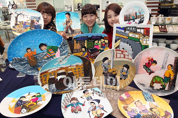 한국도자기가 17일 오후 청계천사옥 한국도자기 매장에서 60, 70년대 예전 겨울모습을 담은 어린 시절의 겨울 추억을 되새겨 볼 수 있는 핸드페인팅 도자기를 전시한다. 이날 오후 직원들이 연탄 배달가는 수레, 난로위의 철 도시락, 길거리 번데기 장수 등의 풍경이 그려진 도자기를 선보이고 있다.