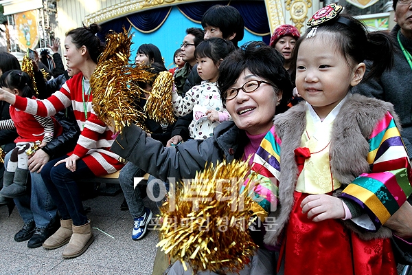 설연휴 마지막날인 24일 오후 서울 잠실 롯데월드에서 나들이 온 할머니와 한복을 차려입은 손녀가 공연을 보며 즐거워 하고 있다.