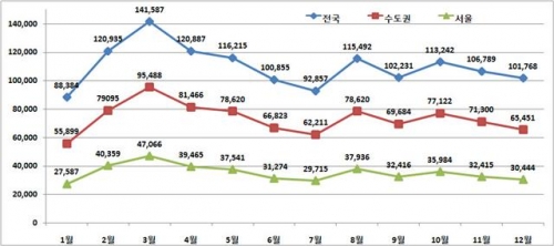 한편 지난해 전·월세 연간 총 거래량은 전국적으로 132만1200건, 수도권 88만1800건으로 나타났다. 월별로 봄 이사철인 3월에 전·월세 거래가 가장 많았고, 하반기에는 9월과 10월에 거래량이 증가했다.