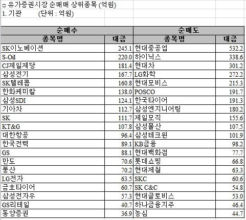 연기금(-1293억원)과 투신(-1183억원)의 매도세가 강하게 나타났다. 보험(-242억원)도 매도우위를 기록했다. 증권선물(695억원), 은행(215억원), 사모펀드(153억원), 종금저축(87억원)은 순매수를 나타냈다.