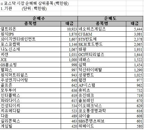 반면 네오위즈게임즈는 54억원을 순매도했다. CJ E&M도 31억원어치를 팔았다. STS반도체(-24억원), SK브로드밴드(-21억원), 태광(-19억원) 등도 매도 상위에 올랐다.