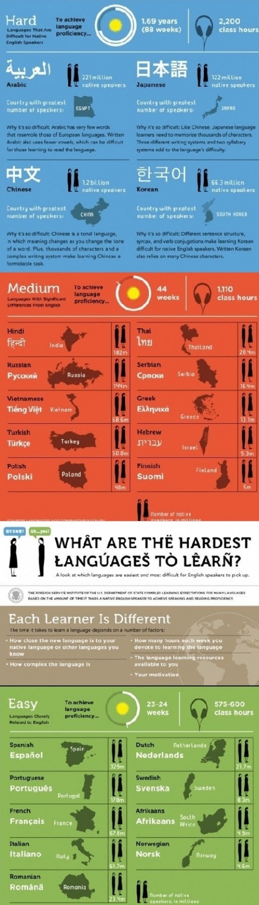 연두색 칸은 비교적 쉬운 난이도의 언어, 주황색 칸은 중간 난이도의 언어, 하늘색 칸은 어려운 난이도의 언어를 나타냈다.