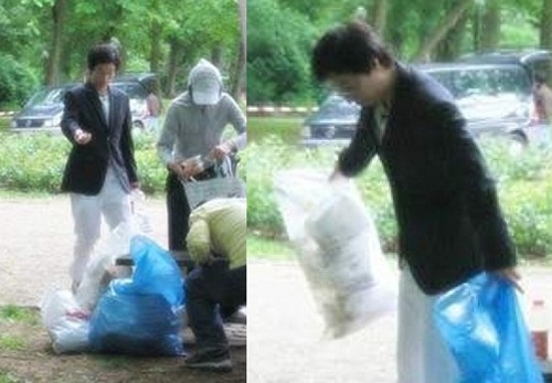 사진 속 유재석은 검은색 재킷에 하얀 바지를 입고 공원의 쓰레기를 치우고 있다. 이 때는 2006년 독일 월드컵 당시 SBS ‘X맨’의 촬영 차 독일을 방문한 당시인 것으로 알렸다.